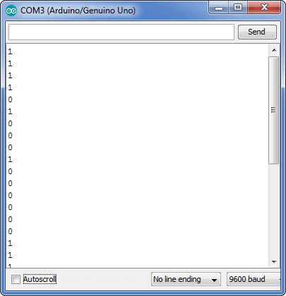 Запустив скетч и не нажимая кнопку, убеждаемся в том, что состояние пина 8 меняется даже от обычного прикосновения к проводу — совершенно непредсказуемым образом. |