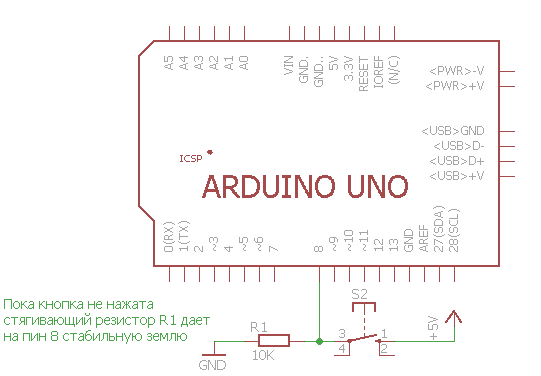 Получается, что 8 пин находится в неопределенном «подвешенном» состоянии и при считывании его значения нельзя определенно сказать, в каком он состоянии — HIGH или LOW. Такое состояние ещё называется высокоомным состоянием или состоянием Z. А провод, соединяющий пин платы с кнопкой, выполняет роль антенны для различных электромагнитных наводок. Именно эти наводки и заставляют контакт вести себя непредсказуемым образом. Для того чтобы устранить эту ситуацию, необходимо сделать так, чтобы в любом состоянии кнопки на 8 пине было однозначное значение. Для этого скорректируем схему следующим образом — подключим пин 8 к земле через резистор номиналом 10 КОм: |