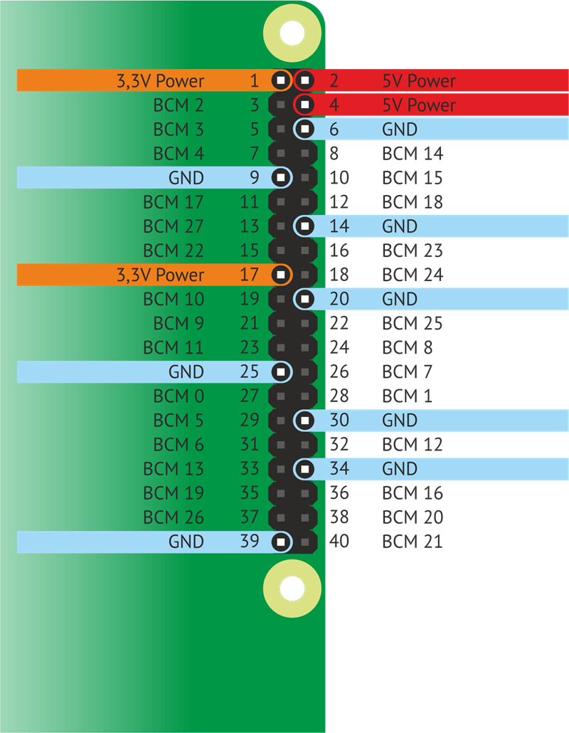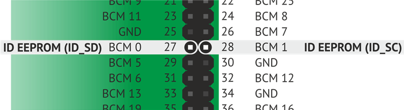 Также 27 (BCM 0) и 28 (BCM 1) пины используются для конфигурации EEPROM Малинки для работы с HAT-устройствами (Hardware Attached on Top — устройства поверхностного монтажа, по сути — обычные платы расширения) и использование этих пинов крайне не рекомендуется. Тем не менее они являются полноценными GPIO-пинами. |