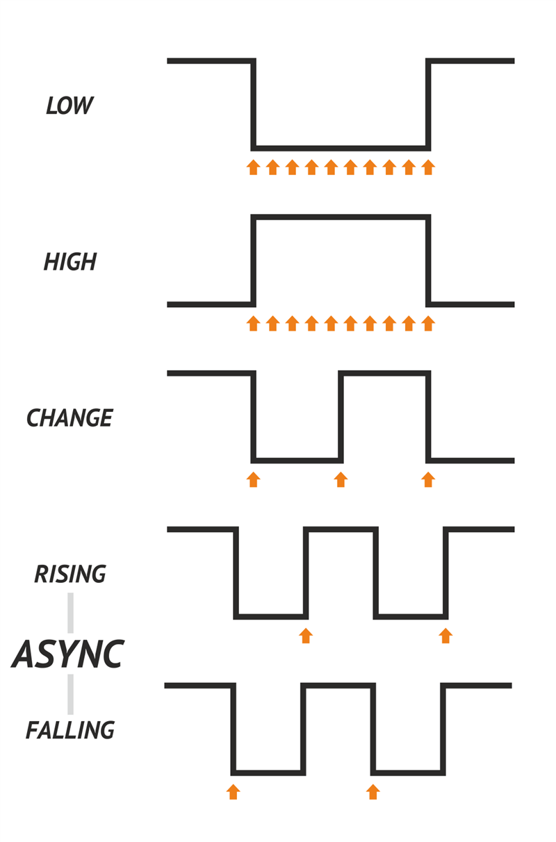 Каждый из 28 пинов в режиме INPUT может генерировать прерывания — по спаду, по фронту, по единице, по нулю, по изменению сигнала, а также в асинхронном режиме по фронту и по спаду: |