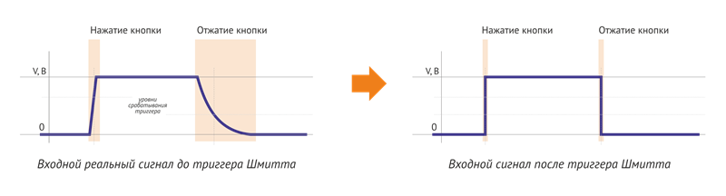 Также все пины в режиме INPUT имеют входную фильтрацию на триггере Шмитта (преобразовывают аналоговый сигнал в цифровой с резкими переходами между состояниями): |