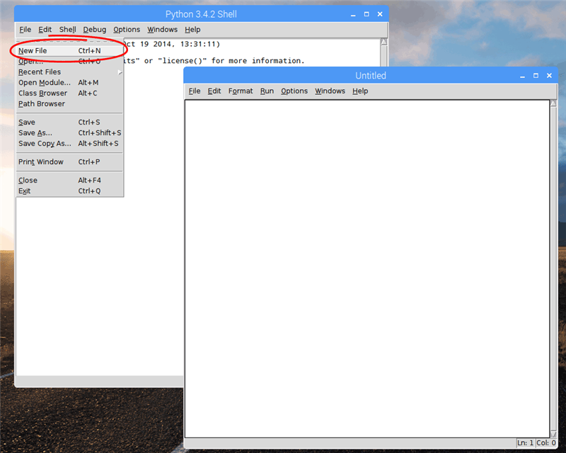 Здесь и далее будет использоваться предустановленный в Raspbian Jessie With Pixel язык программирования Python (Питон) версии 3 вместе со средой разработки. Скрипты на Python можно также писать в текстовом редакторе командной строки nano: |