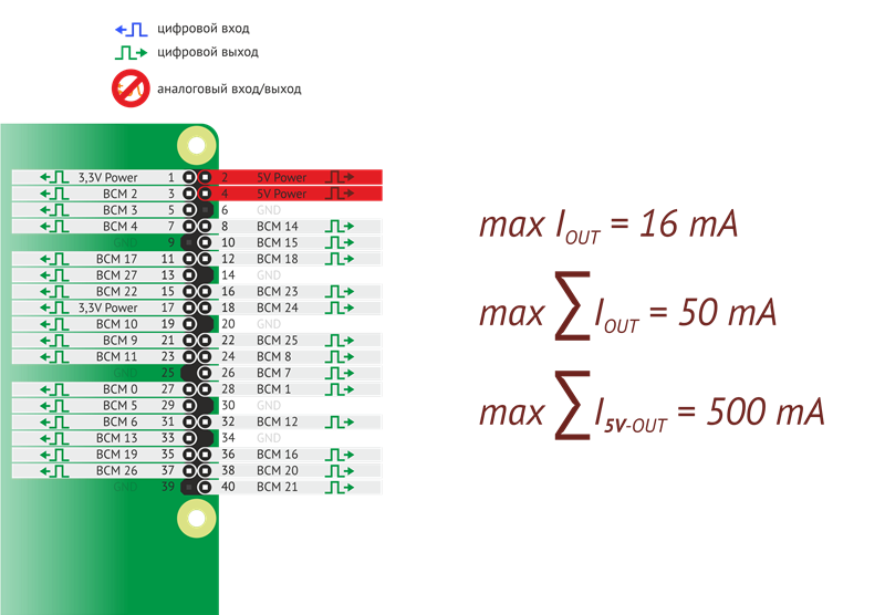 Максимальный выходной ток каждого пина не должен превышать 16 мА. Суммарный выходной ток всех пинов не должен превышать 50 мА. 5-вольтовые пины могут давать больший ток, который остается после питания Raspberry Pi 3 и других периферийных устройств (клавиатуры, мыши) — до 500 мА. |