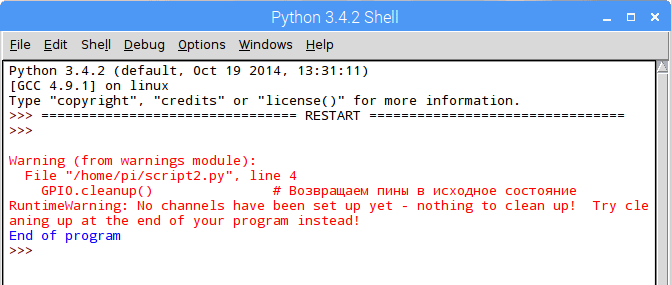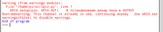 Также программа выдаст ошибку при попытке настроить пин, состояние которого не было возвращено в исходное при помощи GPIO.cleanup(). |