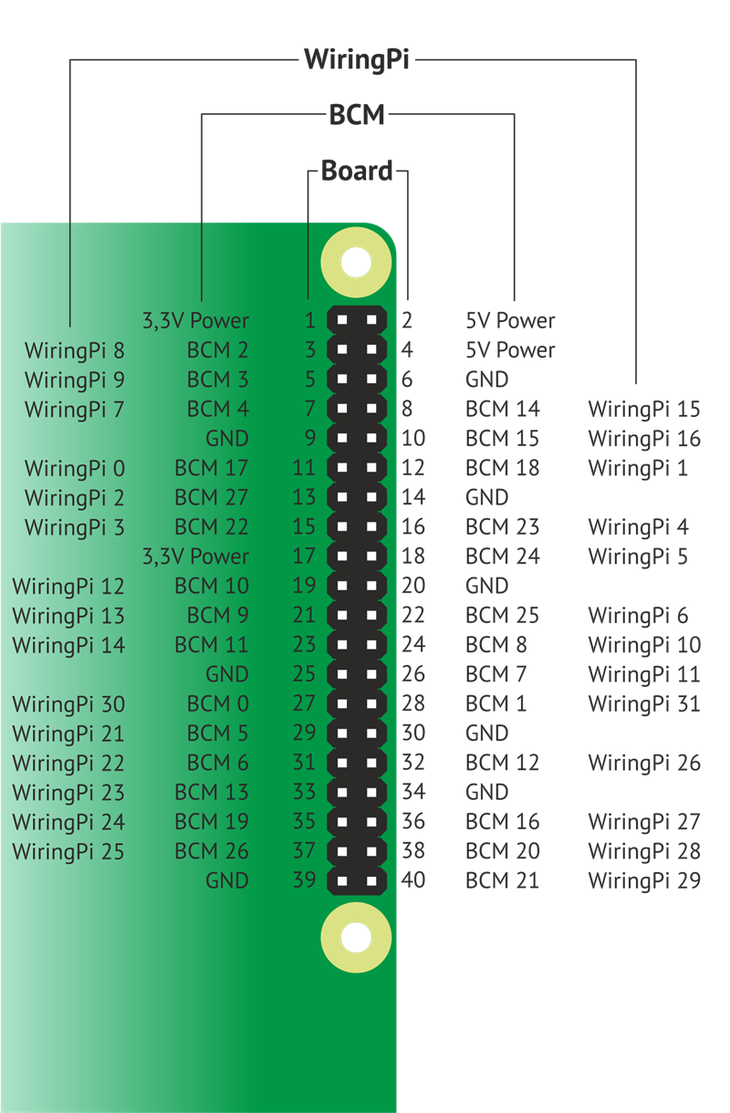 Нумерация пинов Существует несколько вариантов нумерации пинов Малинки: Board (физическая нумерация по порядку) и BCM (нумерация из чипа). Также с библиотекой WiringPi используется своя нумерация: |