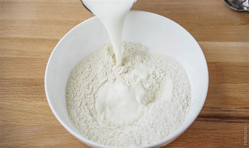 Смешиваем муку и разрыхлитель для теста. Вливаем в муку молоко. |