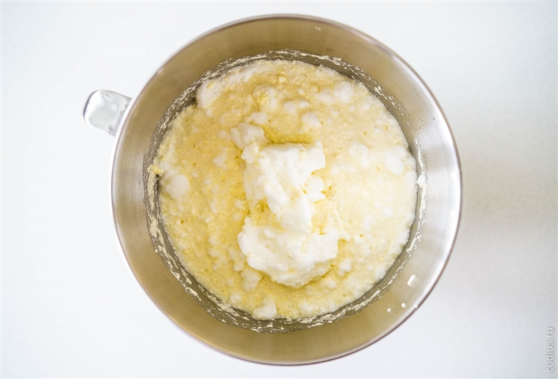 Добавляем муку с молоком в масляно-сахарную смесь, перемешиваем. |