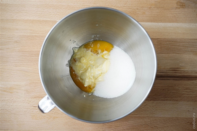 Масло, сахар, желтки и соль взбиваем до растворения сахара. |