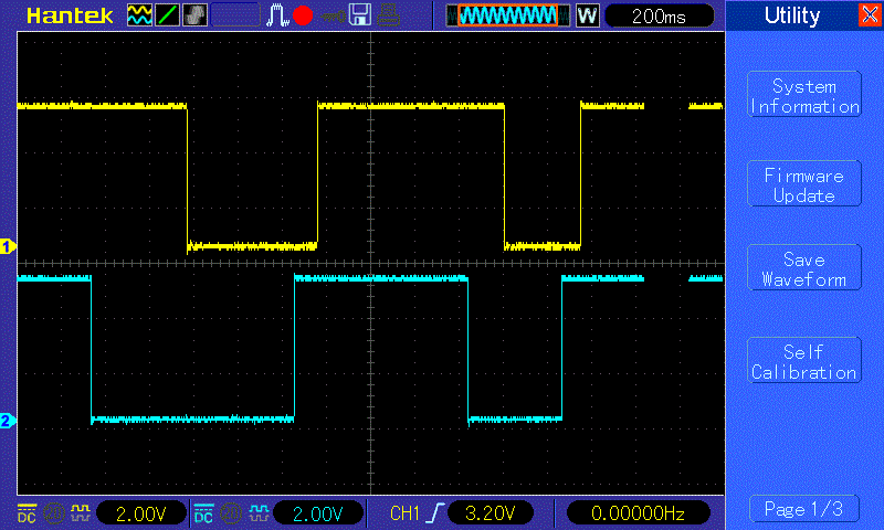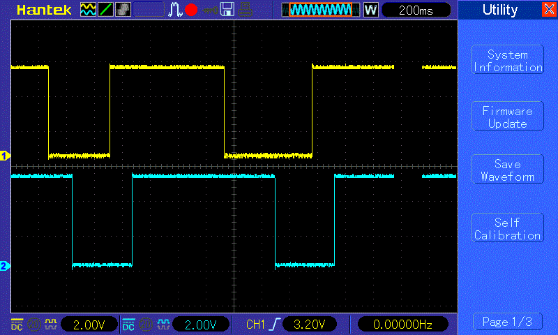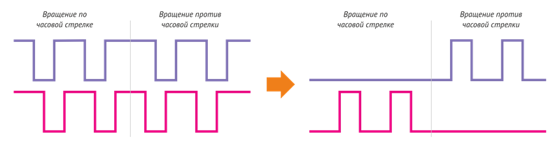 После чего в состоянии покоя на обоих сигнальных выходах будет присутствовать логическая единица (5 В). При вращении по часовой, или против часовой стрелки на сигнальных линиях, с противоположным смещением друг относительно друга, будут появляться отрицательные импульсы — по одному на 1 шаг на каждой линии: |