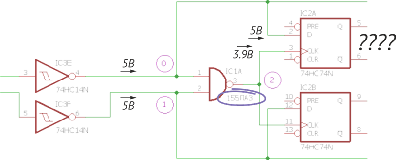 Кстати, несмотря на упоминание аналогичности микросхем, в этой схеме нельзя использовать отечественную микросхему К155ЛА3 в комбинации с импортной 74HC74N. Это связано с тем, что К155ЛА3 на выходе дает логическую единицу в 3.9 вольт, а триггер Шмитта выдает напряжение питания 5 В в качестве логической единицы. И получается, что на вход 74HC74N подаются логические единицы с разными значениями напряжений, и эта схема не может их корректно обрабатывать. Исходя из этого нужно использовать либо К155ЛА3 в связке с К155ТМ2, либо SN74HC00N в связке с SN74HC74N:
