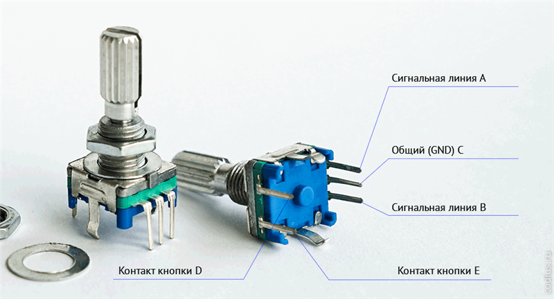Энкодер с кнопкой имеет 5 выходов — 2 выхода (D и E) отвечают за переключатель (кнопку), 1 (С) — общий (GND, земля), а оставшихся 2 (A и B) — импульсные линии, сигнализирующие о вращении. |