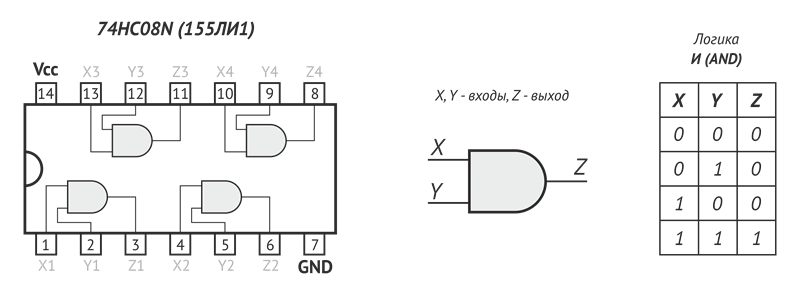 Теперь остается пропустить 3 и 5 сигнал через логику И (74HC08N, 155ЛИ1). Схема распиновки микросхемы и таблица истинности выглядит следующим образом: |