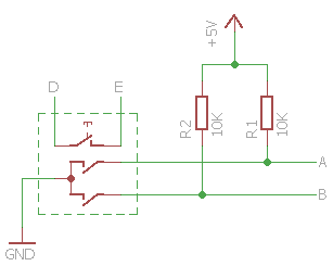 Как видно из рисунка, в состоянии покоя обе пары контактов разомкнуты, а значит сигнальные линии A и B пребывают в высокоомном состоянии (состоянии Z). Поэтому их необходимо притягивать к логической единице подтягивающими резисторами. Стандартная схема подключения энкодера выглядит следующим образом: |