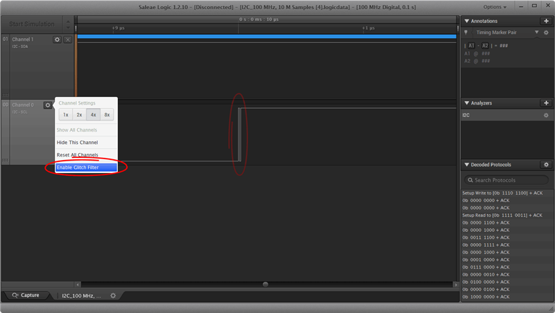 В случае если анализатор протокола, например I2C, по вашему мнению «косячит», убедитесь, что на линии тактирования нет помех (дребезга). В случае его наличия, с ним можно справиться при помощи глитч-фильтра (англ. Glitch Filter — фильтр помех): |