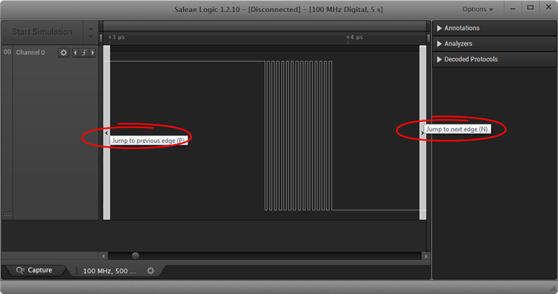 Осуществлять навигацию по полученным данным помогают блоки, появляющиеся при наведении мыши на один из краев области с данными — при нажатии на них можно очень быстро перемещаться к предыдущим/следующим изменениям (перепадам) логических сигналов. |