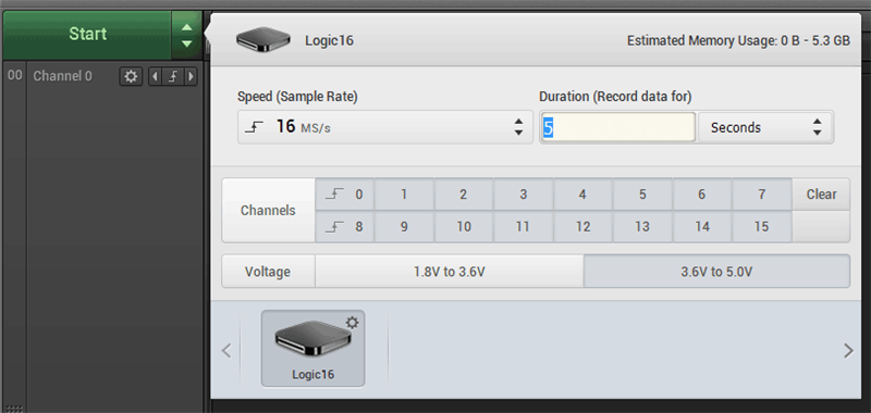 Длительность захвата, также как и количество отслеживаемых каналов, диапазон логических уровней и частота сэмплирования, устанавливается в настройках: |