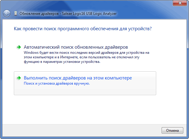 Если все таки драйвер не нашелся автоматически, системе можно подсказать — драйвера располагаются в папке с установленной программой (по умолчанию C:\Program Files\Saleae LLC\Drivers): |