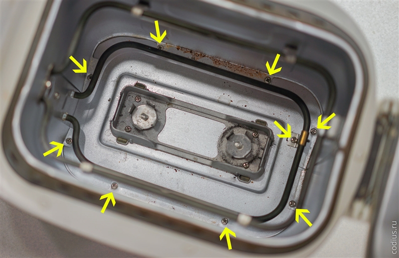 Фотографии к видео, стрелками на фото указаны шурупы, которые необходимо выкрутить для того, чтобы разобрать устройство: |