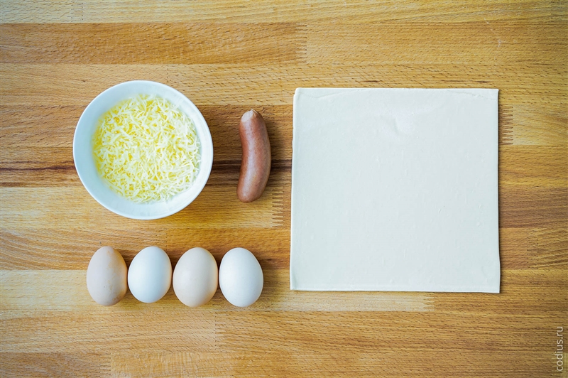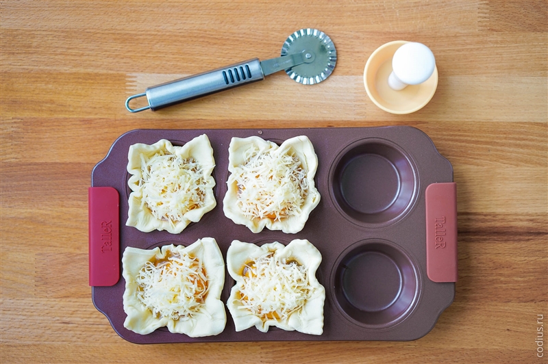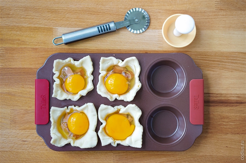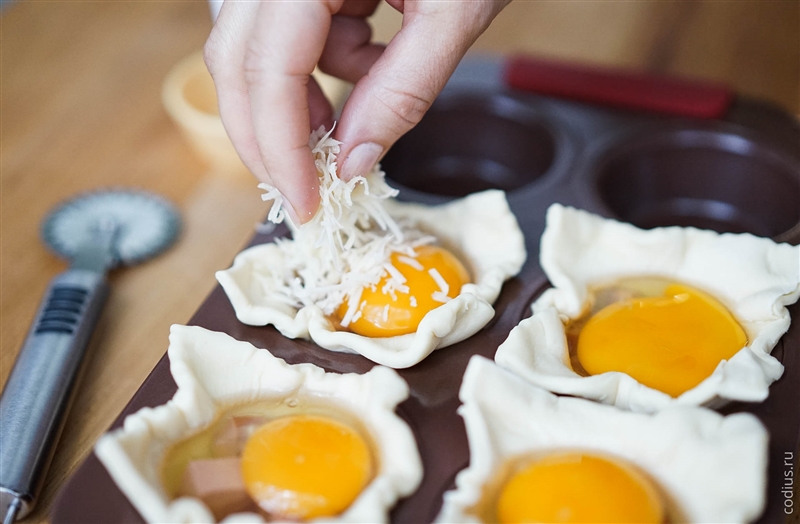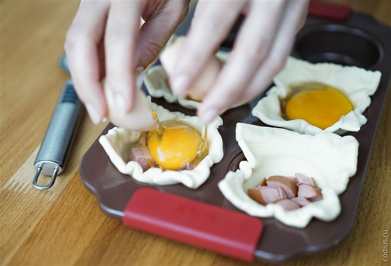 Яйца в корзиночках из слоеного теста с сосисками и сыром пармезан
