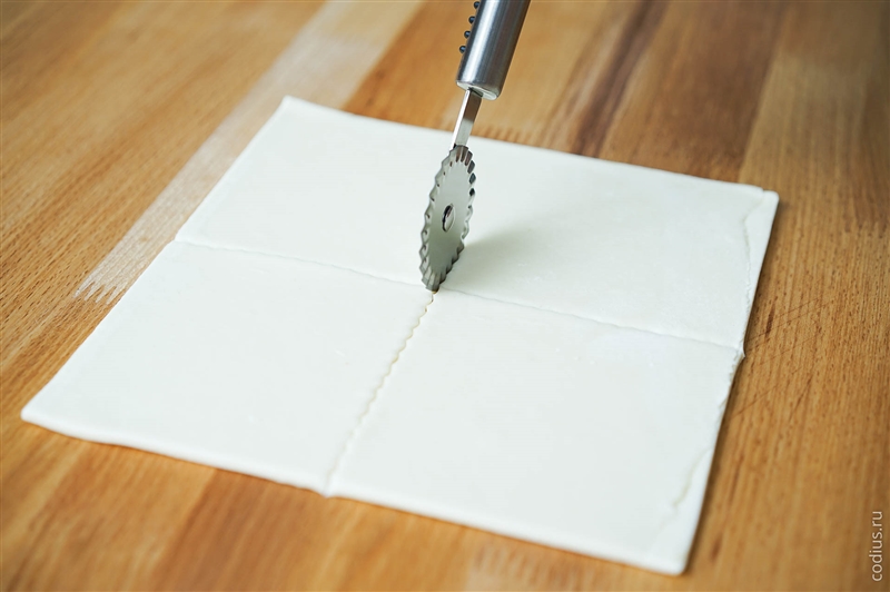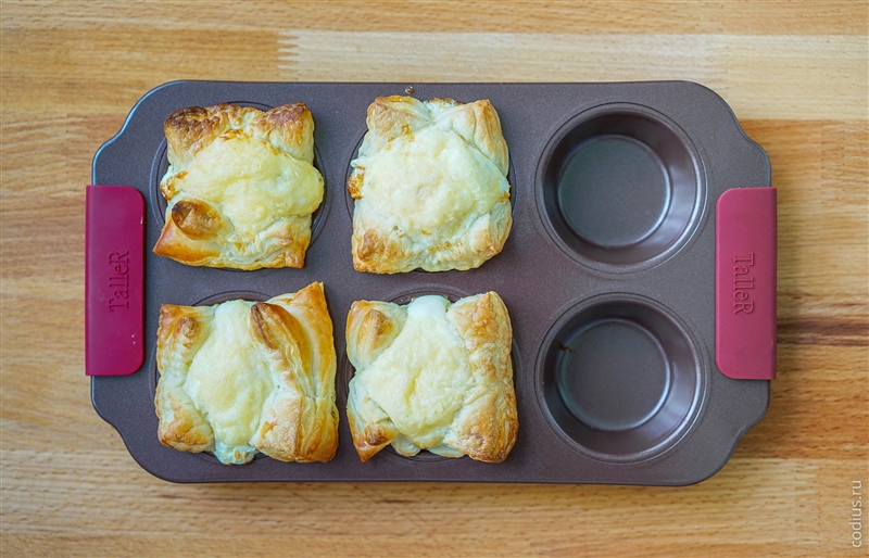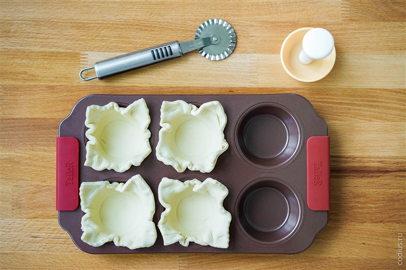 Берем форму для маффинов/кексов (можно даже бумажные формы, но которые держат форму) и укладываем в неё квадраты теста.