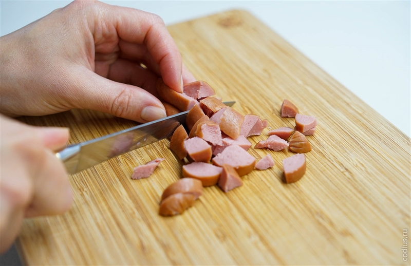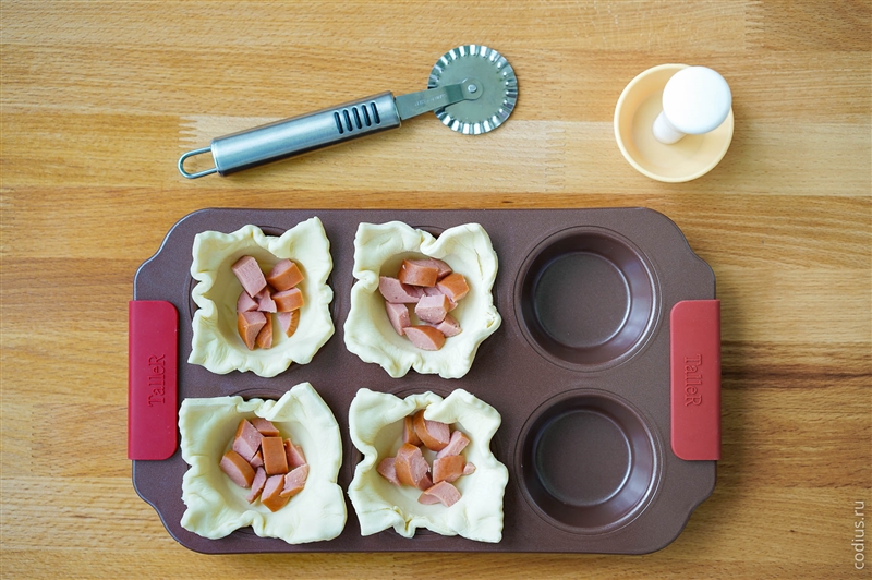 Предварительно отваренную сосиску нарезаем на кусочки и укладываем в получившиеся корзинки из теста.