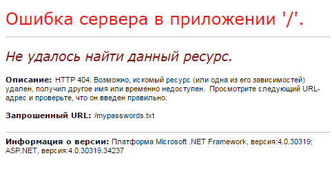 Что будет происходить теперь? Теперь при получении запроса, файл будет возвращен только в том случае, если не будет найдено подходящего маршрута. А поскольку ссылка на наш файл попадает под дефолтный маршрут Default, то при обращении к файлу будет выдана ошибка, что ни контроллер, ни действие не были найдены (у нас нет контроллера mypasswords.txt): |