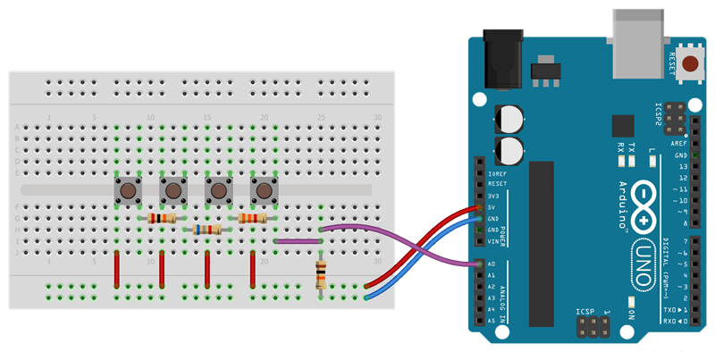 Этот метод использован в коде примера №2 статьи Arduino: Подключение нескольких кнопок к одному аналоговому входу. Схема подключения оттуда же: |