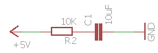 В нашем примере время зарядки конденсатора составит $10КОм \times 10мкФ = 0.1 сек$. |