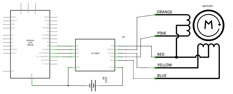 Таким образом драйвер ULN2003A позволяет управлять более мощными моторами, используя внешний источник питания (на примере 9 В мотора): |