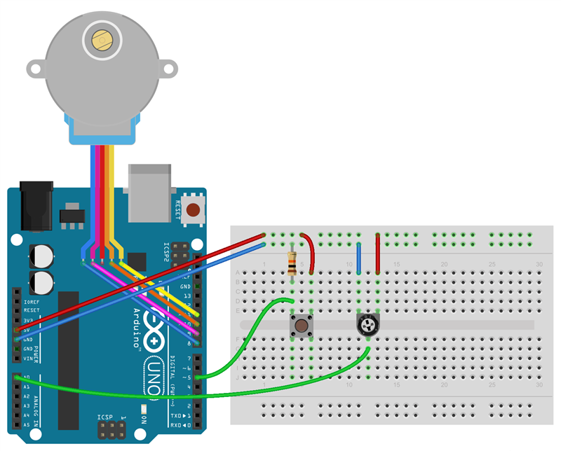 Добавим кнопку для изменения направления вращения и потенциометр для изменения скорости вращения: |