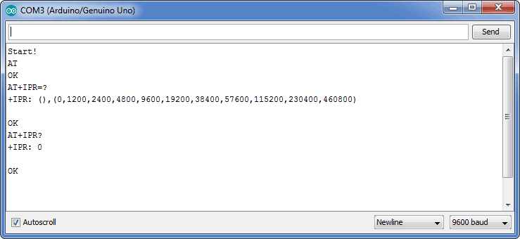 В качестве примера данной группы команд, также можно привести команду AT+IPR. Командой AT+IPR=? можно узнать значения, которые может принимать параметр. Командой AT+IPR? можно узнать текущую скорость обмена данными с модулем, а командой AT+IPR=<...> — задать другую скорость. |