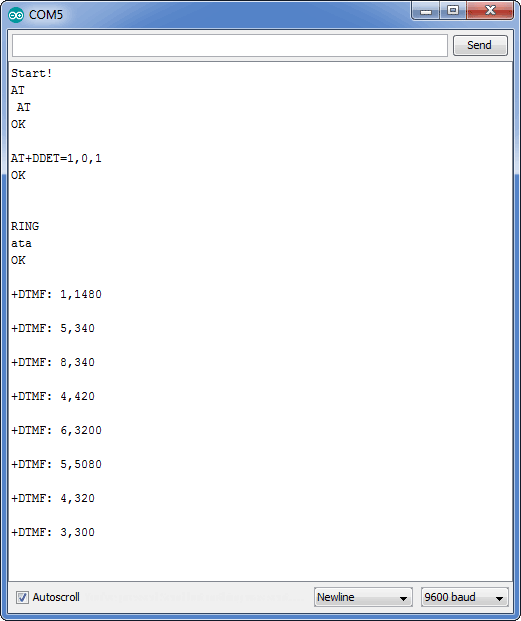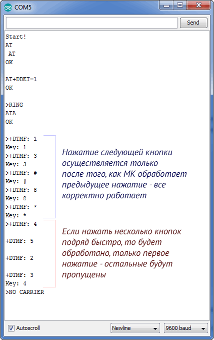 Второй способ предполагает обработку полученного уведомление именно как пачку незапрашиваемых ответов, а не как один ответ. Исходя из этого скорректируем процедуру loop() следующим образом. В скетче для удобства создана дополнительная функция для обработки логики DTMF processingDTMF(): |