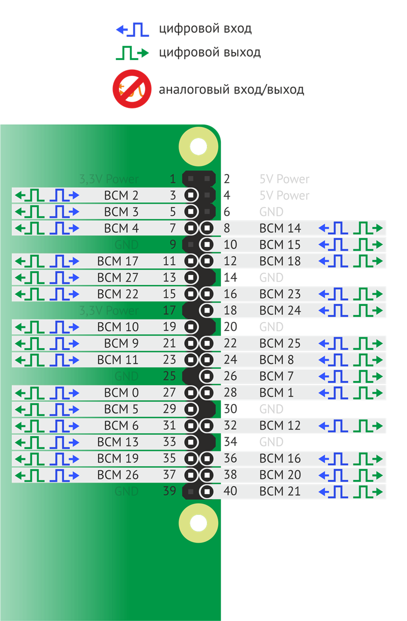 Также 27 (BCM 0) и 28 (BCM 1) пины используются для конфигурации EEPROM Малинки для работы с HAT-устройствами (Hardware Attached on Top — устройства поверхностного монтажа, по сути — обычные платы расширения) и использование этих пинов крайне не рекомендуется. Тем не менее они являются полноценными GPIO-пинами. |