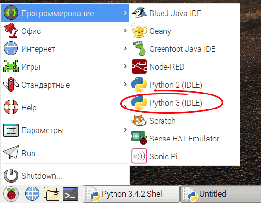 Здесь и далее будет использоваться предустановленный в Raspbian Jessie With Pixel язык программирования Python (Питон) версии 3 вместе со средой разработки. Скрипты на Python можно также писать в текстовом редакторе командной строки nano: |