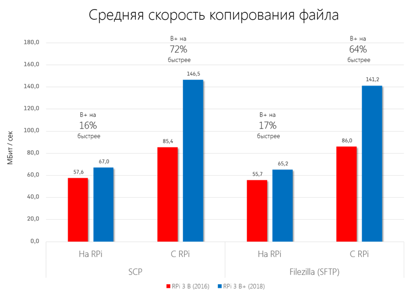 Тестирование скорости обмена данными по сети осуществляется на задаче копирования файлов. Файл копируется с Raspberry Pi 3 на Windows-ПК и обратно — с Windows-ПК на Raspberry Pi 3. SSH-сервер развернут на Windows-ПК. |