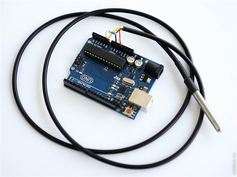 DS18B20 — первый серьезный датчик, который можно применять не только в образовательных целях, но и в реальных системах умного дома. Диапазон измеряемых температур составляет -55...+125°C, при этом точность в 0,5°C (полградуса) обеспечивается в диапазоне -10...+85°C. Такие характеристики и герметичность позволяют использовать данный датчик для измерения температуры в различных агрессивных для обычных микросхем средах, таких как жидкости и почва, служить уличным датчиком температуры и т. д.