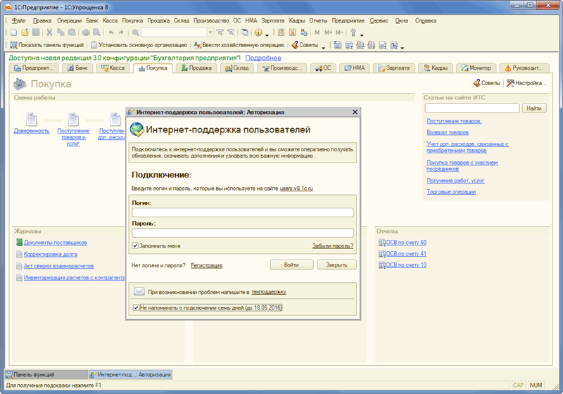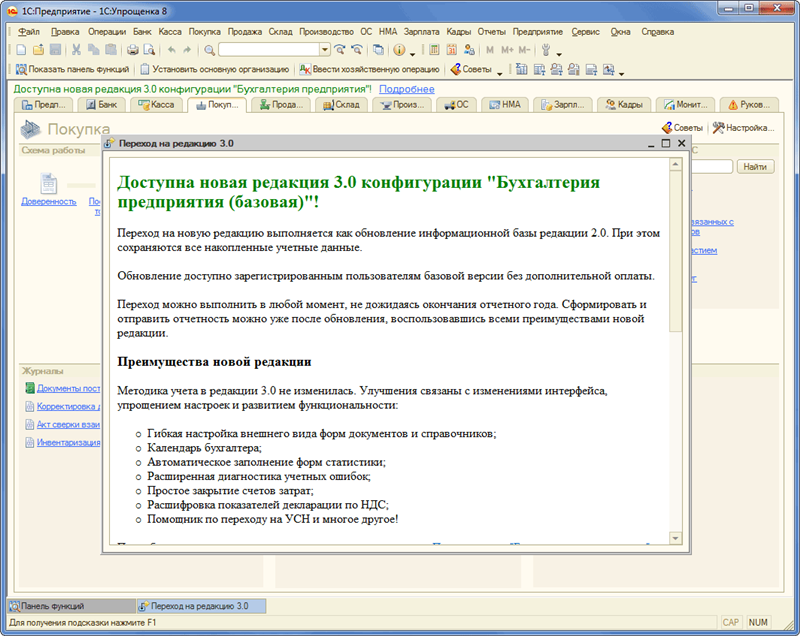 Чтобы убрать надоедливо запускающееся при старте окно «Переход на редакцию 3.0»: