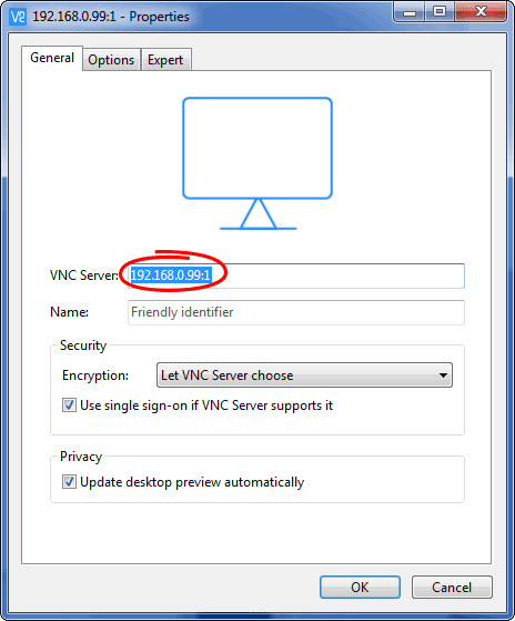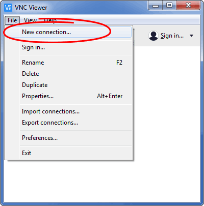 Теперь необходимо настроить клиентскую сторону, в нашем случае Windows, но по сути она может быть любой, в т. ч. и Android. Скачиваем и запускаем VNC-клиент VNC Viewer и в меню File → New Connection создаем новое соединение: |