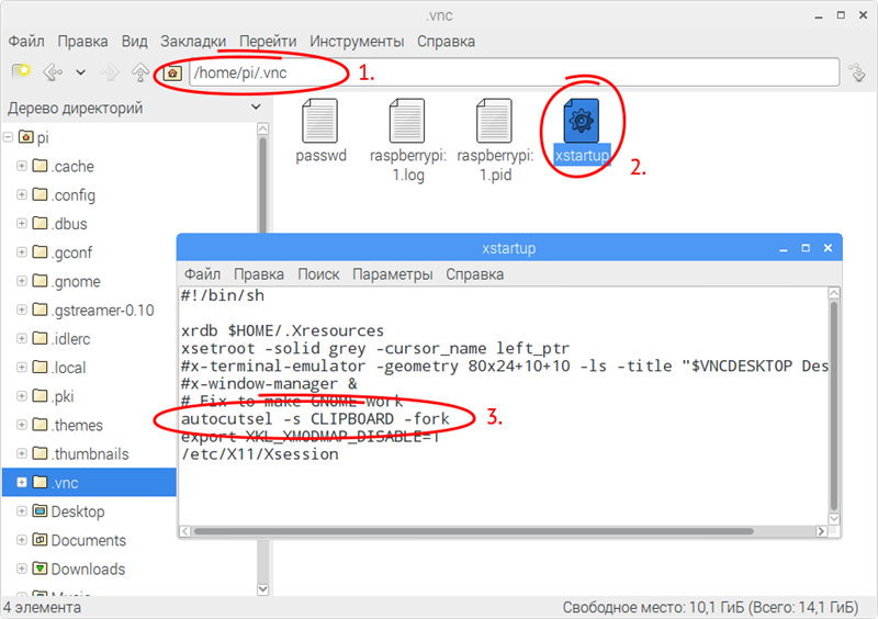 После этого её можно запускать вручную командой autocutsel, а можно добавить в файл запуска VNC-сервера, чтобы утилита запускалась вместе с ним. Для этого в файл /home/pi/.vnc/xstartup нужно добавить строку autocutsel -s CLIPBOARD -fork: |