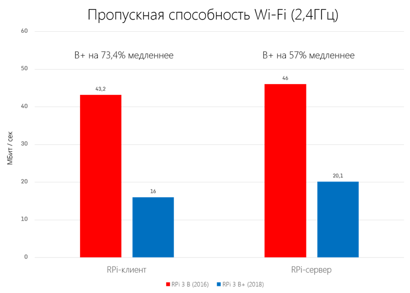 В тестировании пропускной способности по Wi-Fi (2,4 ГГц) Малинка является единственным Wi-Fi-клиентом в сети: |